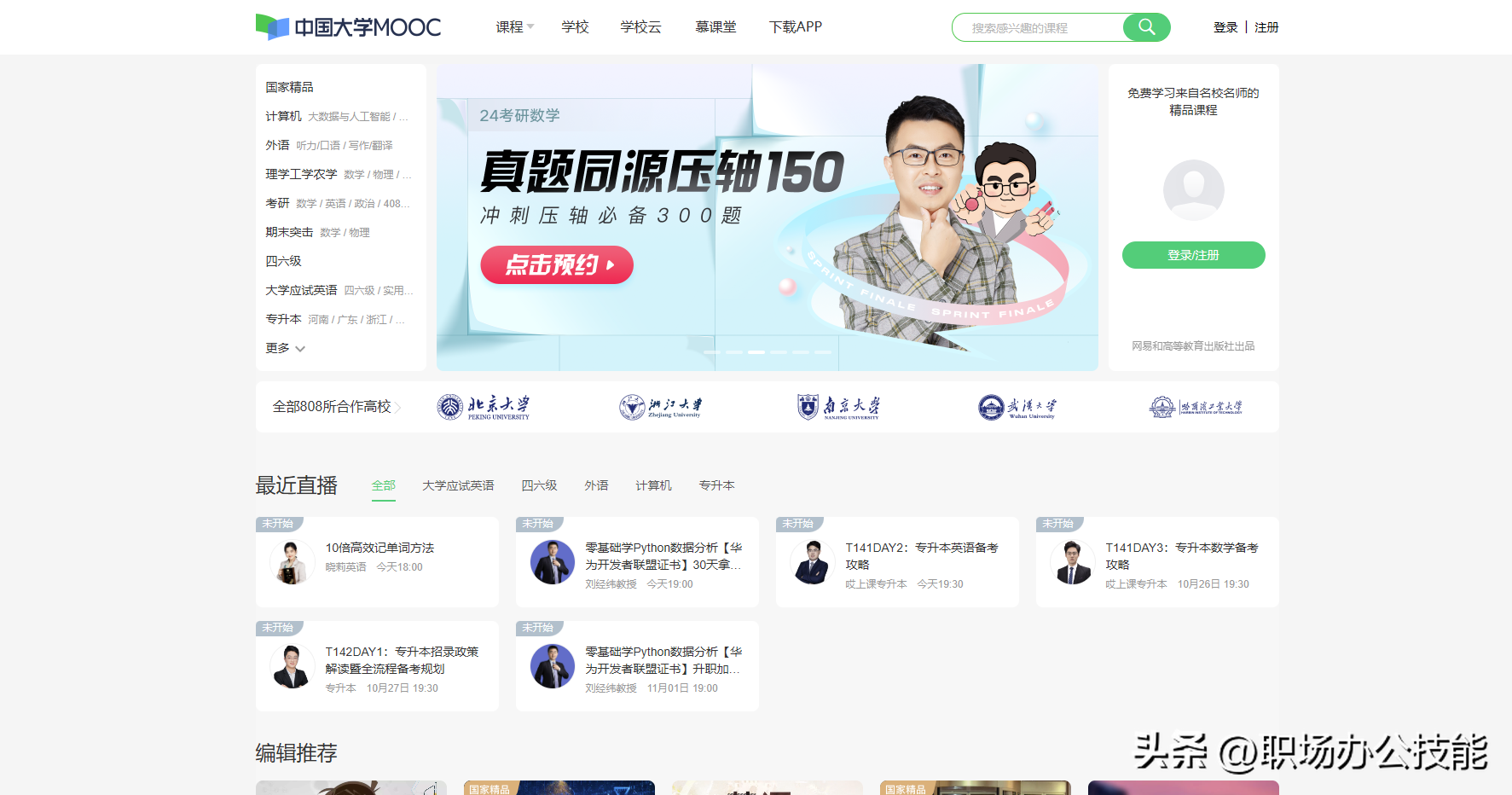 一款拥有国内顶尖大学各类免费课程的网站,里面有很多985高校入驻,包括北京大学、浙江大学、复旦大学、西安交通大学、中山大学、同济大学、武汉大学等等。