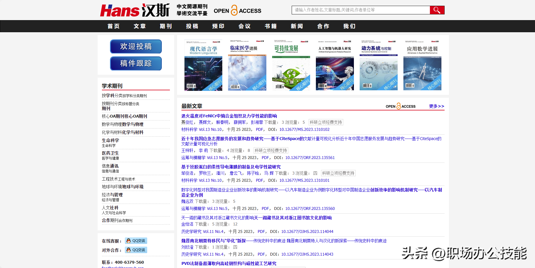 一个聚焦于国际开源学术期刊、电子期刊、开源期刊的出版社网站,它里面的文献资料可以免费下载,覆盖的领域也很全面,包括数学物理、生命科学、化学材料、地球环境、医药卫生、工程技术等领域。