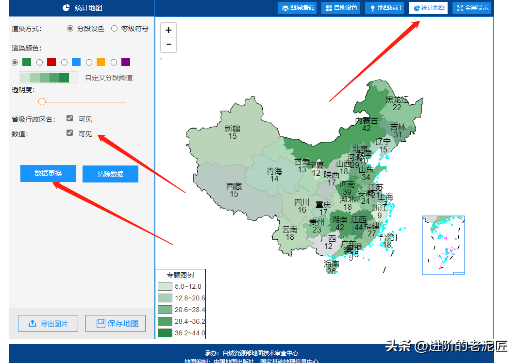 比如要做一张中国地图各省自己公司的数据图,点最右边:自助制图--中国地图,左边栏会出现选项,我点了“分省设色”就会出现省级区划图,然后点统计地图,下载模板,修改成你想要的业绩数据后再上传,即可。具体需要什么根据自己的需求去设置即可。最后导出,有倒计时30秒,等等就可以了。