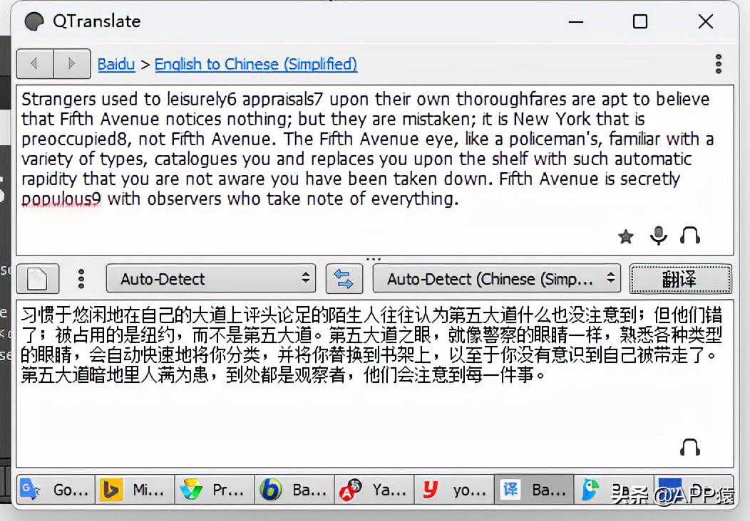 5、QTranslate【QTranslate】是一款聚合了九个主流翻译引擎如谷歌,百度,有道,必应等的翻译小工具,这样子你只需要一个翻译软件就省去了需要再不同翻译站点切换的麻烦,【QTranslate】还有取词翻译/朗读到全文翻译/朗读/图片OCR翻译等功能,这些常用功能在
