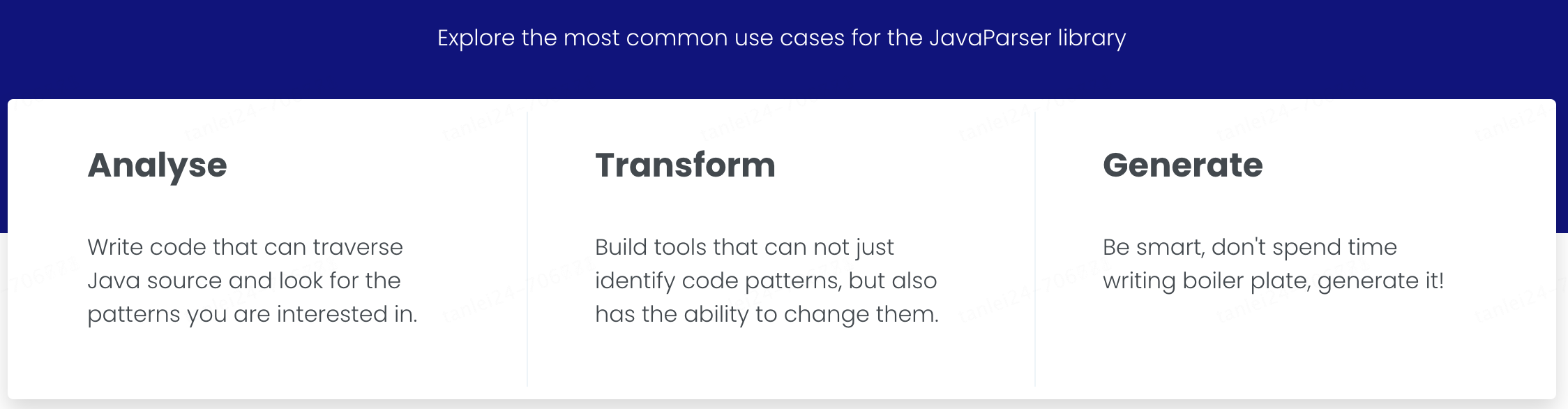 在上一章节里就用到了数据提取,源码替换功能。这里附上JavaParser的相关链接: