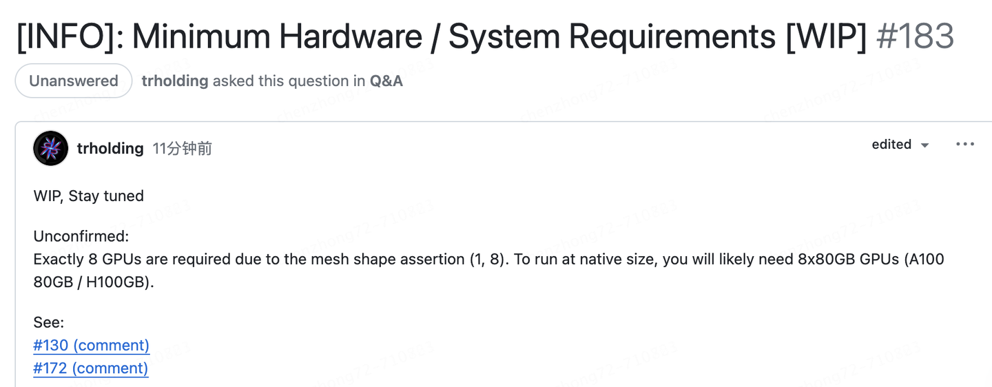 注意:硬件要求多大呢?由于模型规模较大(314B参数),需要有足够GPU、内存的机器才能使用示例代码测试模型。