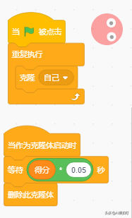 当程序开始运行的时候,不断的克隆自己,当作为克隆体启动时,间隔一段时间删除次克隆体,等待的时间是个表达式,用得分*0.05,也就是说得分越高,等待的时间越长,这样表现出来的舞台效果就是贪吃蛇的身体越长。这里又使用到了克隆三件套(克隆自己、当作为克隆体启动、删除此克隆体)。