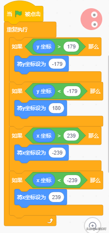 实现穿墙的逻辑不是很复杂,这里主要涉及到舞台坐标的知识,我们知道Scratch的舞台坐标范围x轴方向[-240,240],y轴方向[-180,180]之间。那么穿墙的逻辑就很明白了,当贪吃蛇到达舞台顶端,y坐标大于179时,就把他的y坐标设置为舞台底端的坐标-179,同理,在舞台的底端时,设置正好相反;左右两端设置如上代码所示。